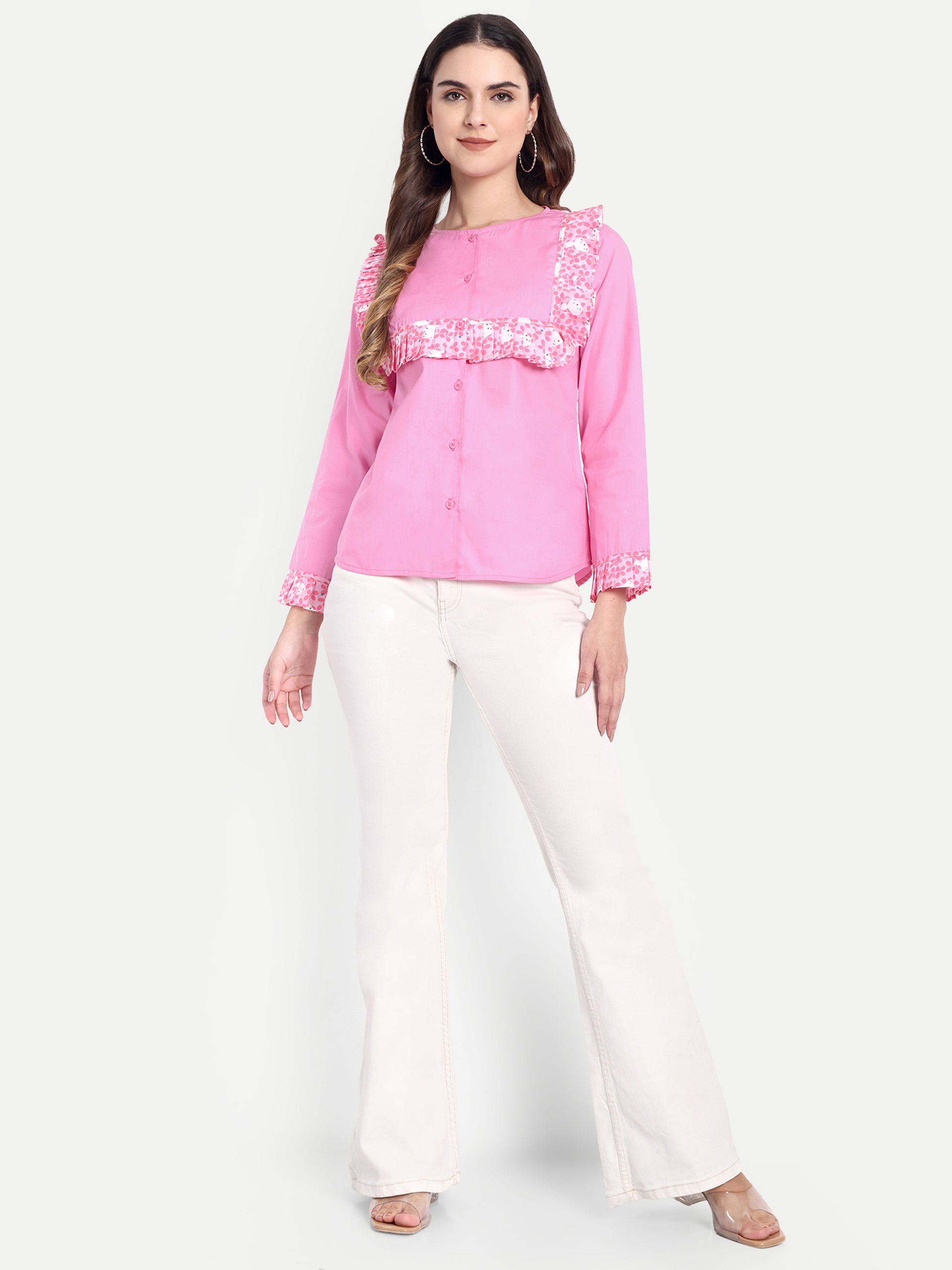 This shirt has Round neck,full Sleeves frill on hemline ,frill on front and full placket button closure and curved hem line. Product DetailsSize & FitBrand Fit: Classic Material & Care100% Cotton Machine Wash SpecificationsSleeve Length