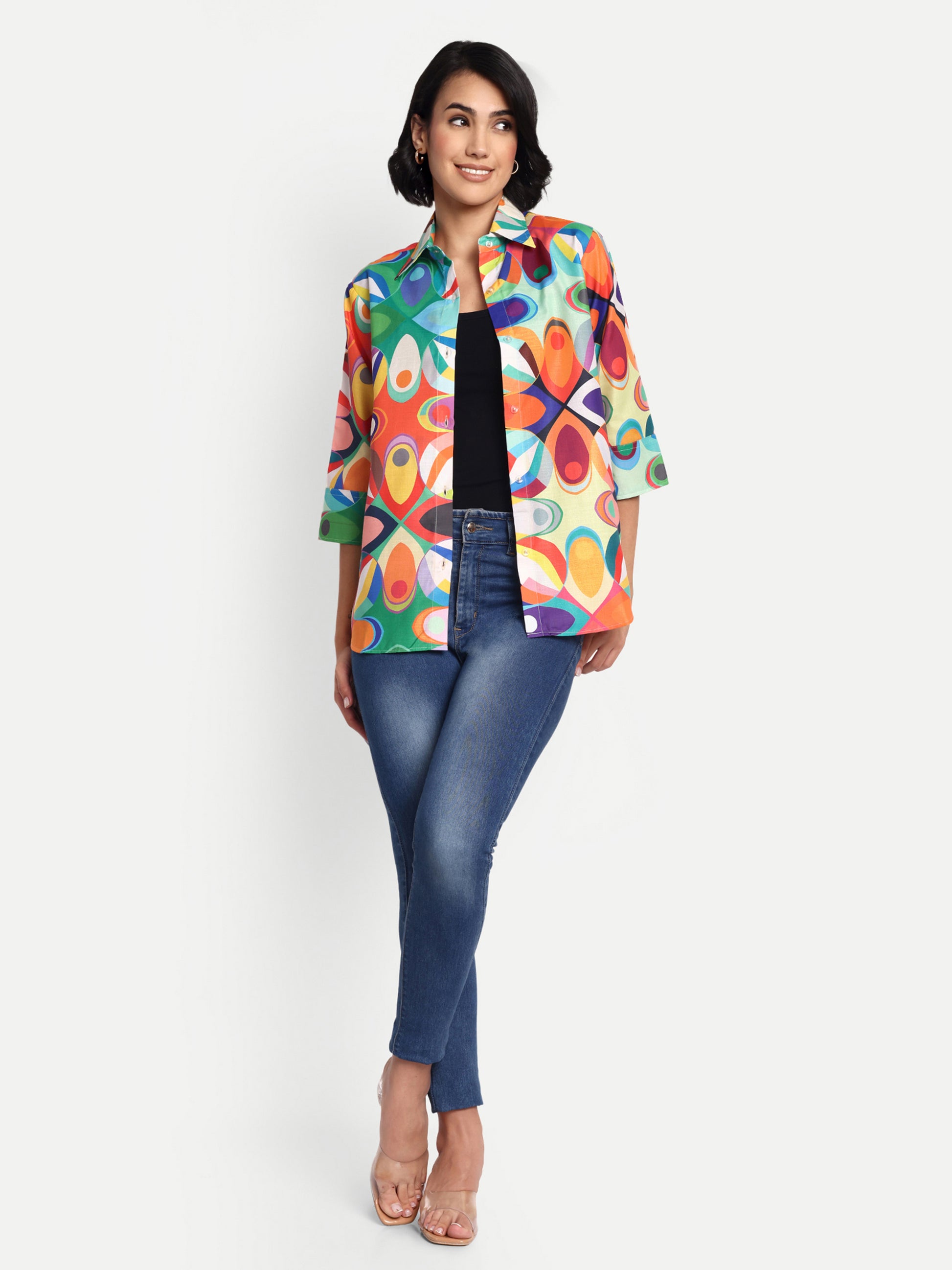 Multi coloured Abstract Printed, opaque Casual Cotton shirt ,has a Shirt collar, button placket, na pocket, Long sleeves, high-low hem